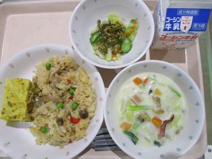 きのこピラフ・パンプキンオムレツ・くきわかめのサラダ・ クラムチャウダー・牛乳