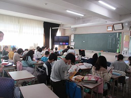 4校時は4年生全クラスみせます。まずは担任の先生以外の授業で社会科、その次は書写の授業です。最後は国語の授業で、辞書で調べながら班で1つタブレットを使っての共同学習です。これ以上タブレットを使うと、止まってしまうそうです。ICT支援員のラインズさんも一緒にやってくれました。