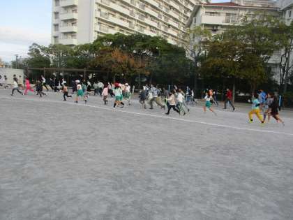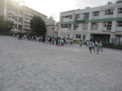 朝練習スタートです。2年生はダッシュで、5年生はペースを確認しながら走り出しました。