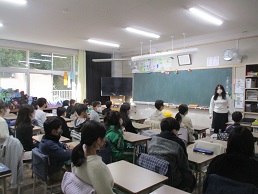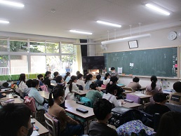 放送朝会を聴く5年生の姿です。