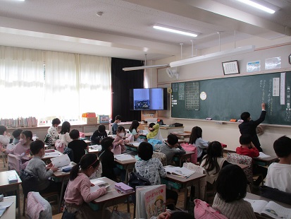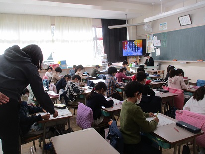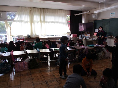 机を動かして何かをやっているのは、日本の昔遊びのこまです。凧に続いて、どうしたらうまくまわるか思考する子供たちの姿が見られました。