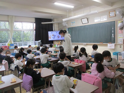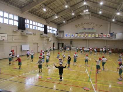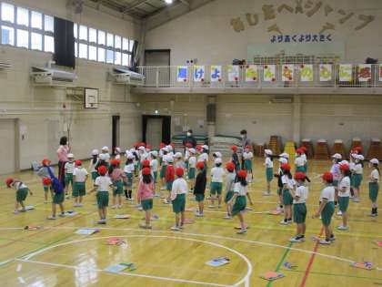2校時の1年生です。体育館体育は、2クラス合同の授業で、体育科の授業でもなわとびを取り組んでいます。
