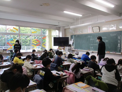 1校時の3年生3クラスの授業です。体育館体育、国語の漢字学習、社会科です。