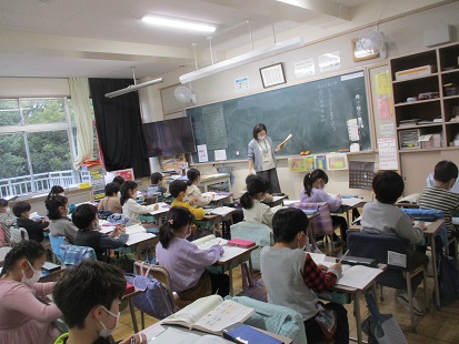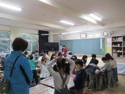 3校時の1年生の授業の様子です。国語科の授業、いとはかるたをグループごとにやっていました。4人の一人は読み手となっています。1クラスは3人グループで栄養士の先生に質問するための練習をしていました。