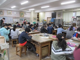 3校時の3つの学年の授業の様子です。3年生のリコーダーの学習、6年生の図画工作科、5年生の体育科バスケットボールです。