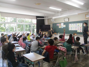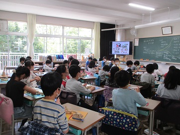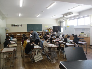 4校時の3年生3クラスの授業の様子です。図画工作科、初めての音楽室での授業。初めての外国語活動の授業です。