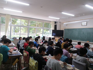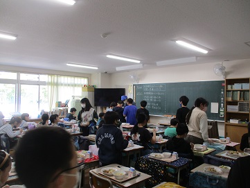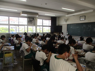 2年生から6年生までの1クラスずつの給食風景です。落ち着いた雰囲気で、マナー良く食べることに集中しています。