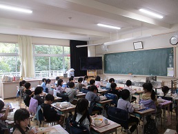 給食の準備をしているクラス、静かに食べることに集中しているクラスです。