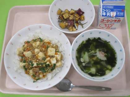 マーボー丼 牛乳 中華スープ お芋・お豆・おさかなの揚げ煮