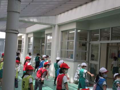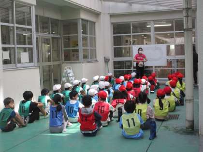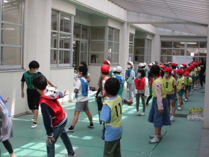 今日は中庭で低学年のリレー練習が始まりました。まずはバトン練習です。