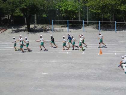 今日の高学年リレー練習の校庭は男子の練習です。まずはバトンお受渡しの練習ですね。