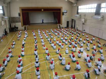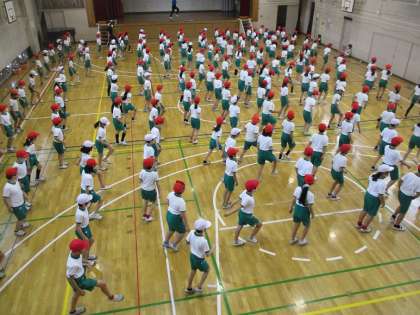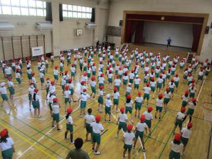 1校時の4年生は、体育館で運動会練習です。学年表現の練習でした。先生がお手本(写真2枚目)を見せながら仕上げていきます。