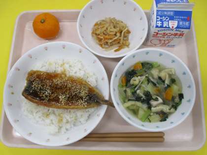いわしのかば焼き丼 牛乳 切り干し大根の炒め煮 くずきり汁 冷凍みかん です。