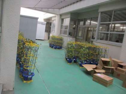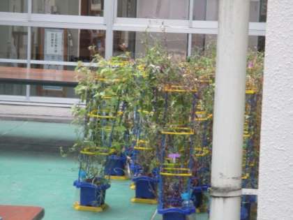 明日台風13号に備え、外出ていた1年生の育てている朝顔を中庭に避難させました。これで強風大雨でも大丈夫です。