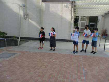 日本以外の国の言葉での朝の挨拶隊です。今週いっぱい毎日国を変えています。