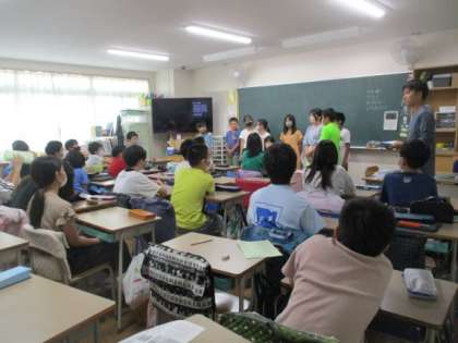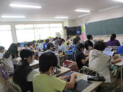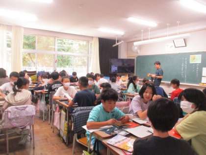 3校時の6年生3クラスの授業の様子です。写真真ん中のクラスは、開校40周年記念式典での呼びかけのオーディションをしているようでした。