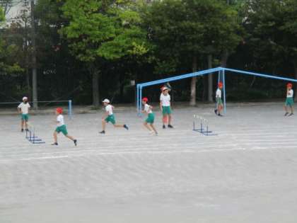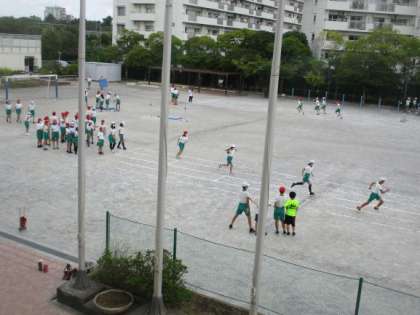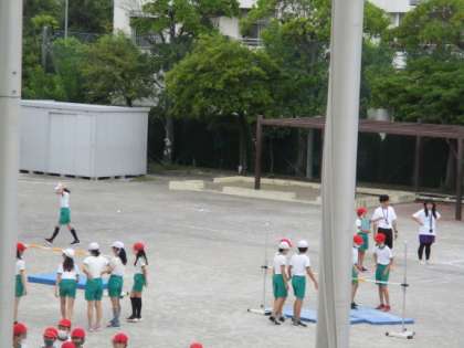 体育大会の種目決めのために、試しに競技を体験します。決して体育の授業ではありませんが、熱中症には細心の注意をしています。