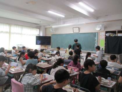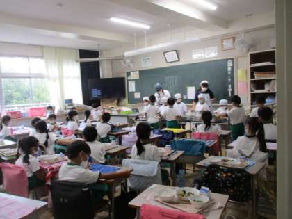 今日の給食の様子です。5年生は静かな食事中、1年生は給食の準備真っ最中、3年生はもうすぐ食事が始まるという場面です。
