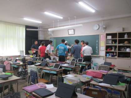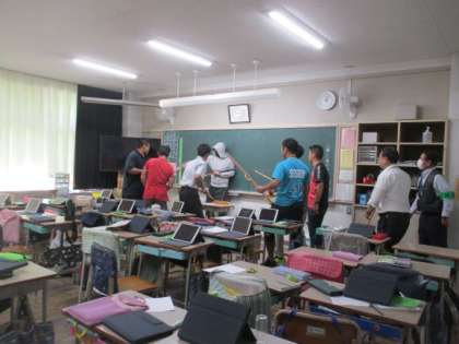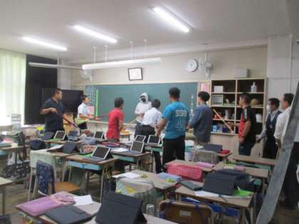 先生方が不審者を追い詰めます。やり方は、警察の方の指導の下行われました。