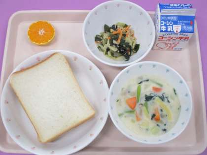 ハムカツサンド 牛乳 ホワイトシチュー わかめとツナのサラダ みかん です。