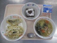 【麦ごはん・小松菜ふりかけ・じゃがいもコロッケ・キャベツの甘酢和え・玉ねぎのみそ汁】
