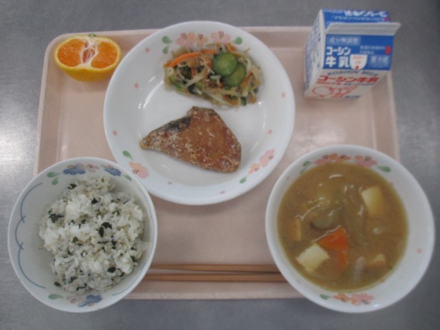 【わかめごはん・かつおの竜田揚げ・もやしのなめたけあえ・厚揚げと玉ねぎのみそ汁・みかん】