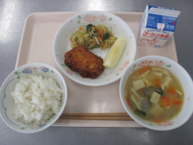 【麦ごはん・いかめんち・キャベツのごまおかか和え・けの汁・りんご】