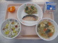 【五目ごはん・わかさぎのから揚げ・小松菜とかぶのお浸し・じゃがいもと厚揚げのそぼろ煮】