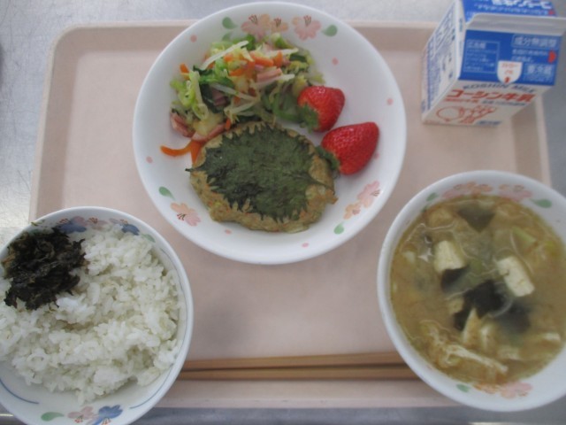 【麦ごはん・のりとあさりの佃煮・あじのさんが焼き・菜の花のからし和え・わかめのみそ汁・いちご】