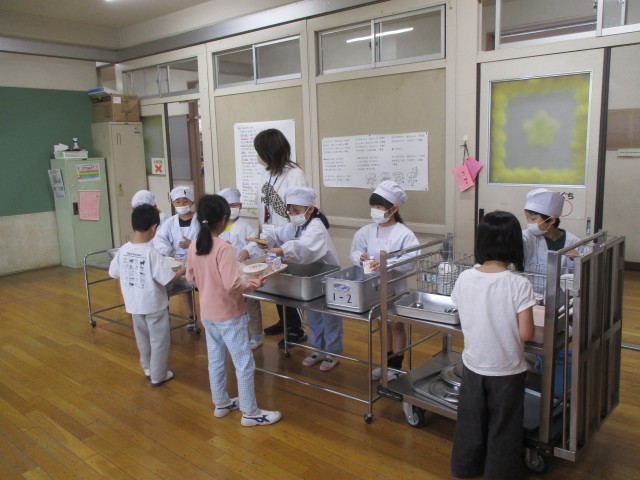 1年生 給食の準備です 公開日 2026/04/21 更新日 2026/04/21 校長日記 1年生も、給食当番さんは白衣に帽子、マスクをつけて、しっかり配膳を行っています。給食を受け取るほうも真剣です。おいしい給食を毎日、もりもり食べています。 いいね(0)