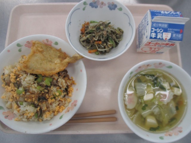 1年生を迎える会にちなんだお祝い献立です。ちらし寿司、お祝いすまし汁を取り入れました。