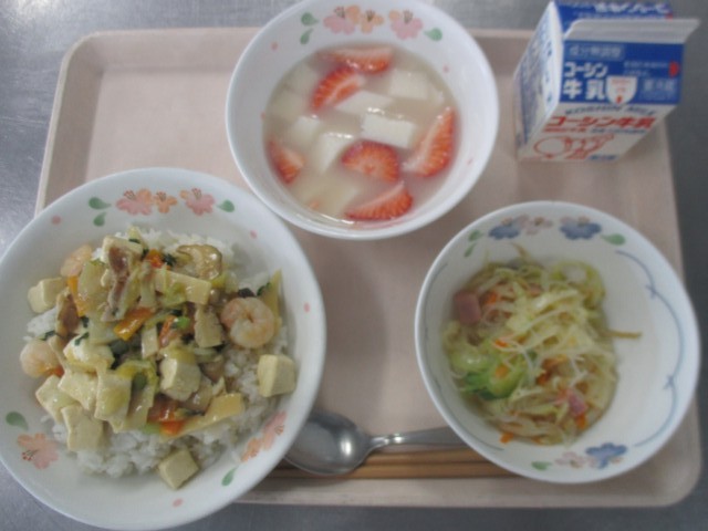 豆腐とえびがたっぷりの中華丼は、具だくさんで具材のうま味がたっぷりの一品です。デザートは旬のいちごを使った杏仁豆腐です。