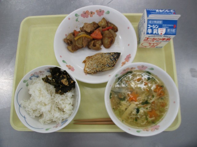 【麦ごはん・わかめそぼろ・さばのごまつけ焼き・揚げごぼうと蓮根のみそ炒め・千切り野菜のかきたま汁】