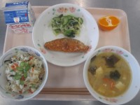 【チンジャオロース丼、きゅうりのピリ辛炒め、リャンバンサンスー、中華風コーンスープ、オレンジ、牛乳】