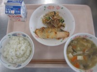 【わかめご飯、鶏のから揚げ、ちくわの磯部揚げ、切り干し大根入卵焼き、舟形キュウリ、お弁当用煮物、ミニトマト、牛乳】