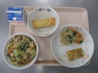 【鶏飯(けいはん)、にがごいの炒りあげ、ねったぼ、牛乳】