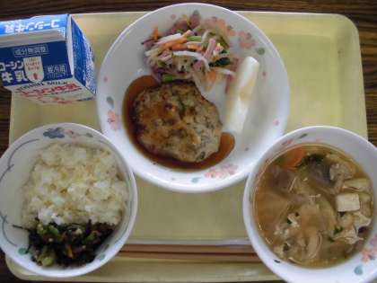 【きび入りご飯、オクラ入り江戸川のだし、ゴボウたっぷりつくね焼き、ダイコンの菊花和え、いものこ子汁、梨、牛乳】
