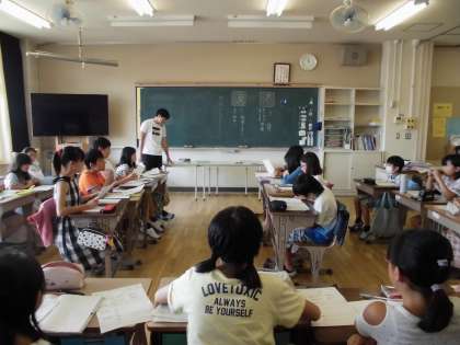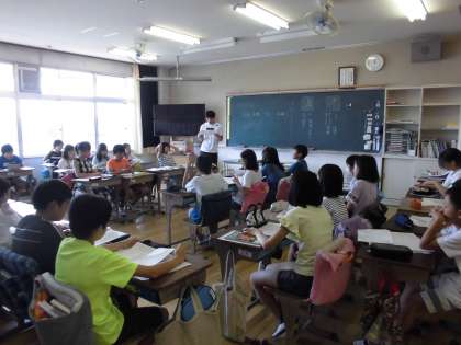 国語の時間には、対立する二つの意見に分かれ、意見を戦わせる「意見交換会」を行いました。写真のグループでは「遊びに行くのは山か川か?」が題材です。相手の意見をよく聞き反論しなくてはいけません。熱い意見交換になったかな。