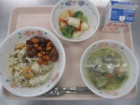 【ガーリックピラフ、ししゃものからあげ、グリーンサラダ、クラムチャウダー、スイートスプリング、牛乳】