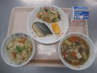 【海苔とアサリの佃煮、きび入りごはん、肉じゃが、田舎汁、牛乳】
