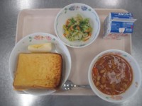 【麦ごはん・のりのふりかけ・鶏肉のピリ辛焼き・野菜炒め・小松菜とじゃがいものみそ汁】