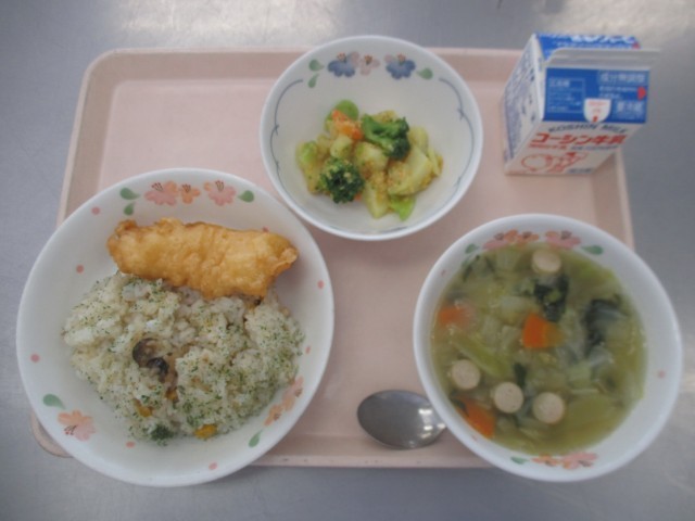 【菊花ごはん・ますのもみじ焼き・小松菜のごま和え・豆腐ともずくのかきたま汁・菊花...