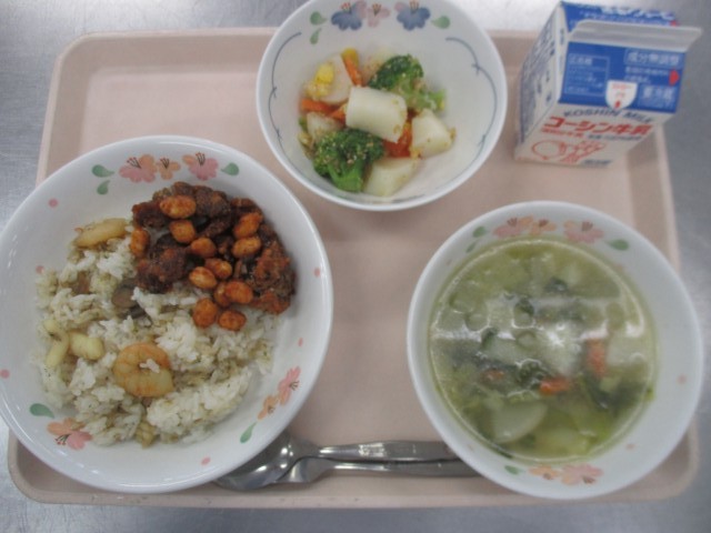 【大豆入り五目ごはん・レバーの変わり香味だれ・じゃがいもとれんこんのきんぴら・白...