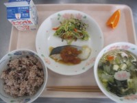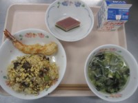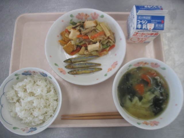 【麦ごはん・生揚げと豚肉のみそ炒め・きびなごのカレー揚げ・ワンタン入りわかめスー...
