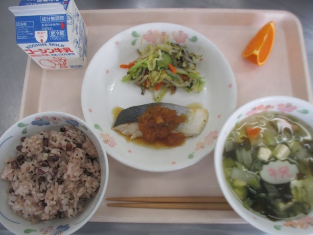 【お赤飯・ぶりのおろしだれ焼き・小松菜の磯和え・お祝いすまし汁・せとか】ひとくち...