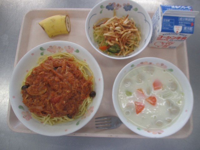 【ツナのトマトスパゲッティ・ポテトのハニーサラダ・野菜のクリームスープ・バナナ】...