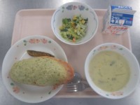 【小松菜ビスキュイパン・めひかりのスパイシー揚げ・コーンチャウダー・フレンチサラ...