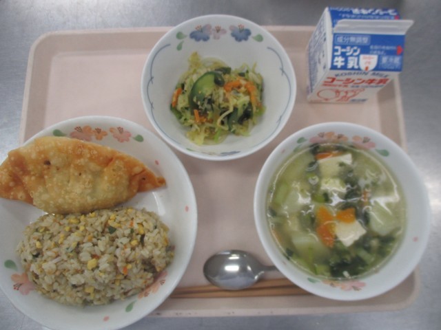 【たまごとにらのチャーハン・ジャンボ揚げぎょうざ・海藻サラダ・春雨とじゃがいもの...