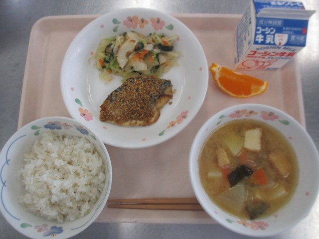 【麦ごはん・さばのごま焼き・ちくわ入り小松菜の和えもの・厚揚げのみそ汁・デコポン...