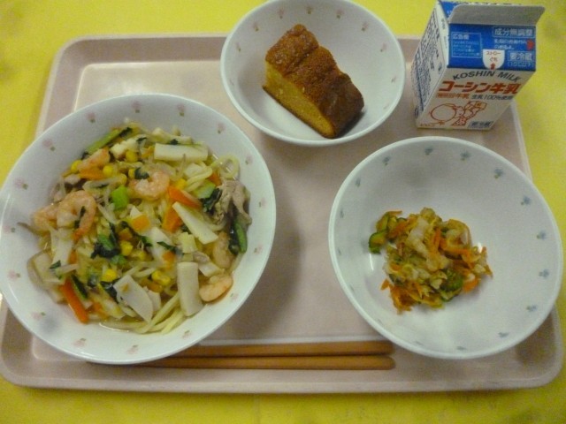 長崎ちゃんぽん 白菜の和え物 カステラ 牛乳